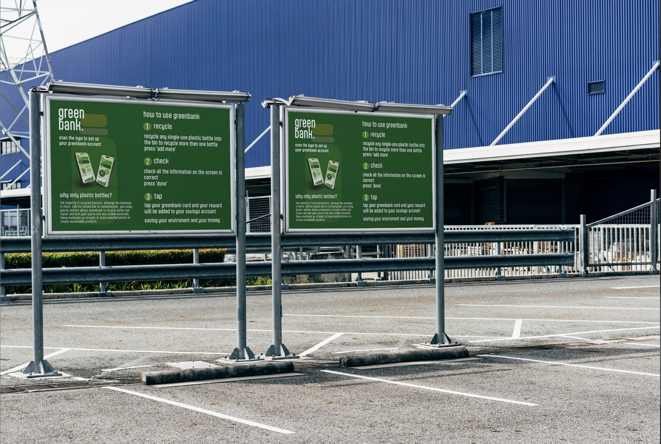 The name Greenbank is a double entendre, it refers to a typical money bank and the physical recycling deposit bin around city centres. The chosen typeface is very friendly and direct, Greenbanks can be used by anyone, recycling and saving money is a rewarding process and the aptly font is confident and encouraging.